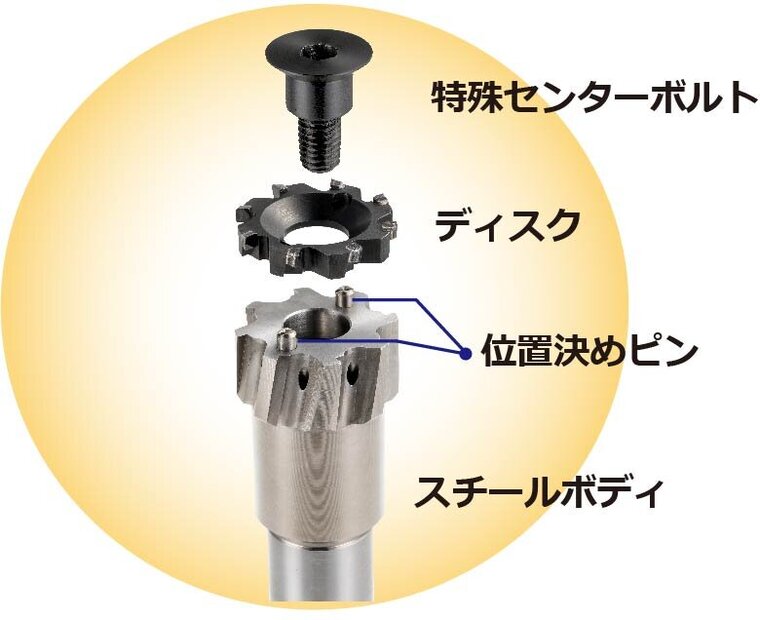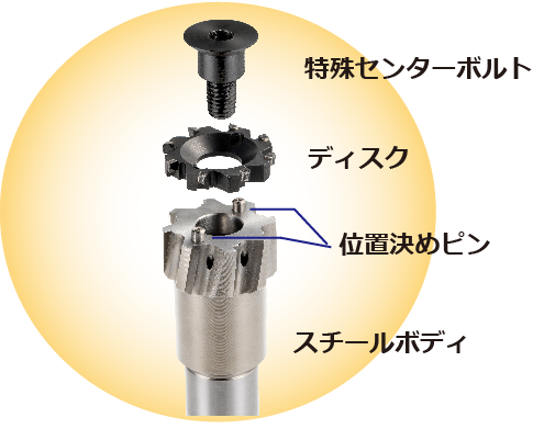特殊センターボルトによる中心1本締結のみで刃先フレ精度を確保します。 誰でも約3分で替刃交換を完了でき、刃先高さを調整する段取時間は不要です。