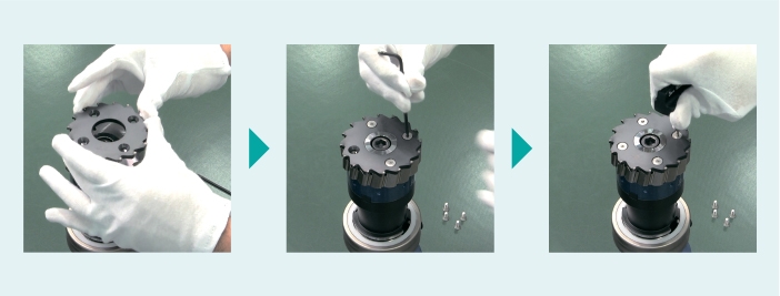 六角棒レンチで、ボルトとディスクを取りはずします。